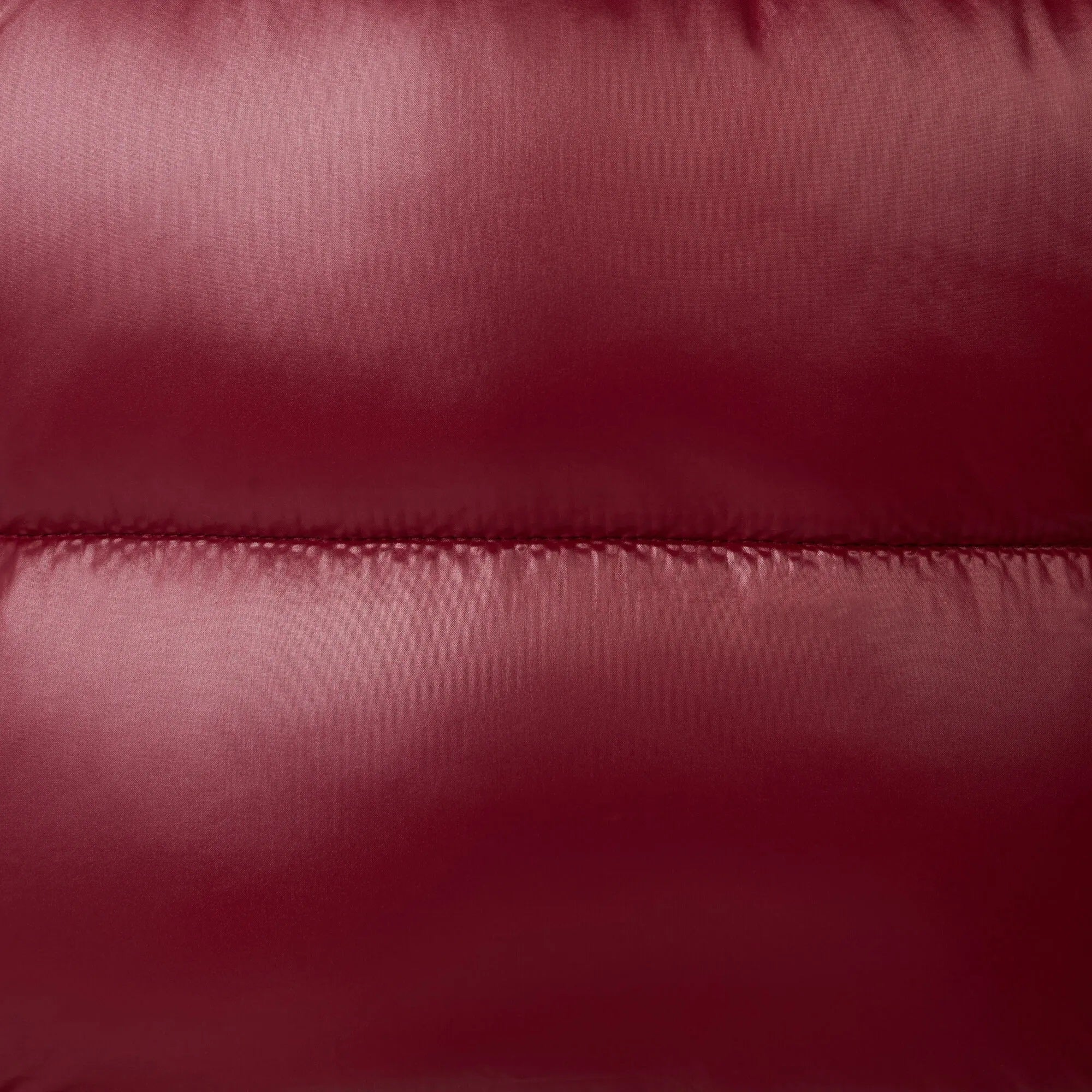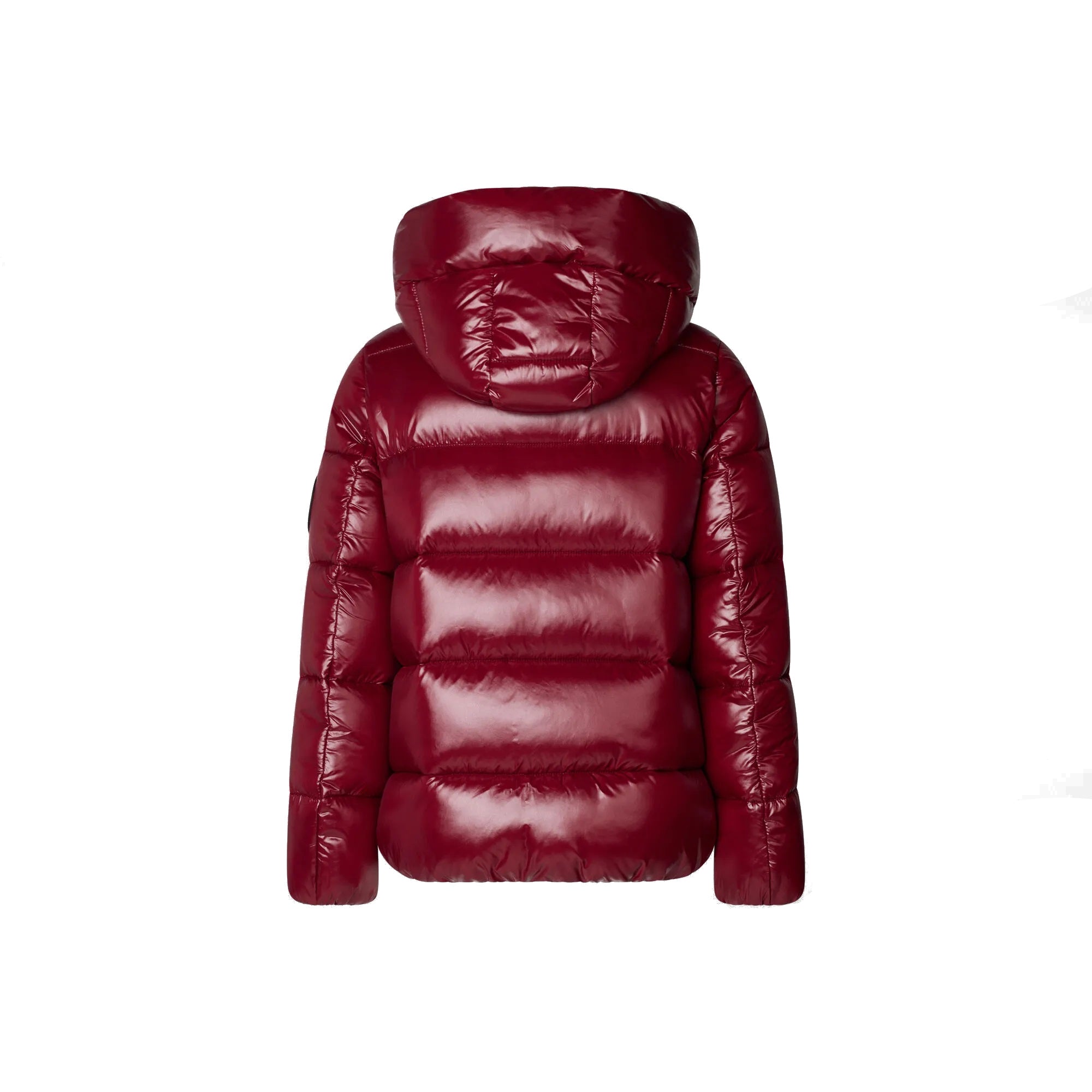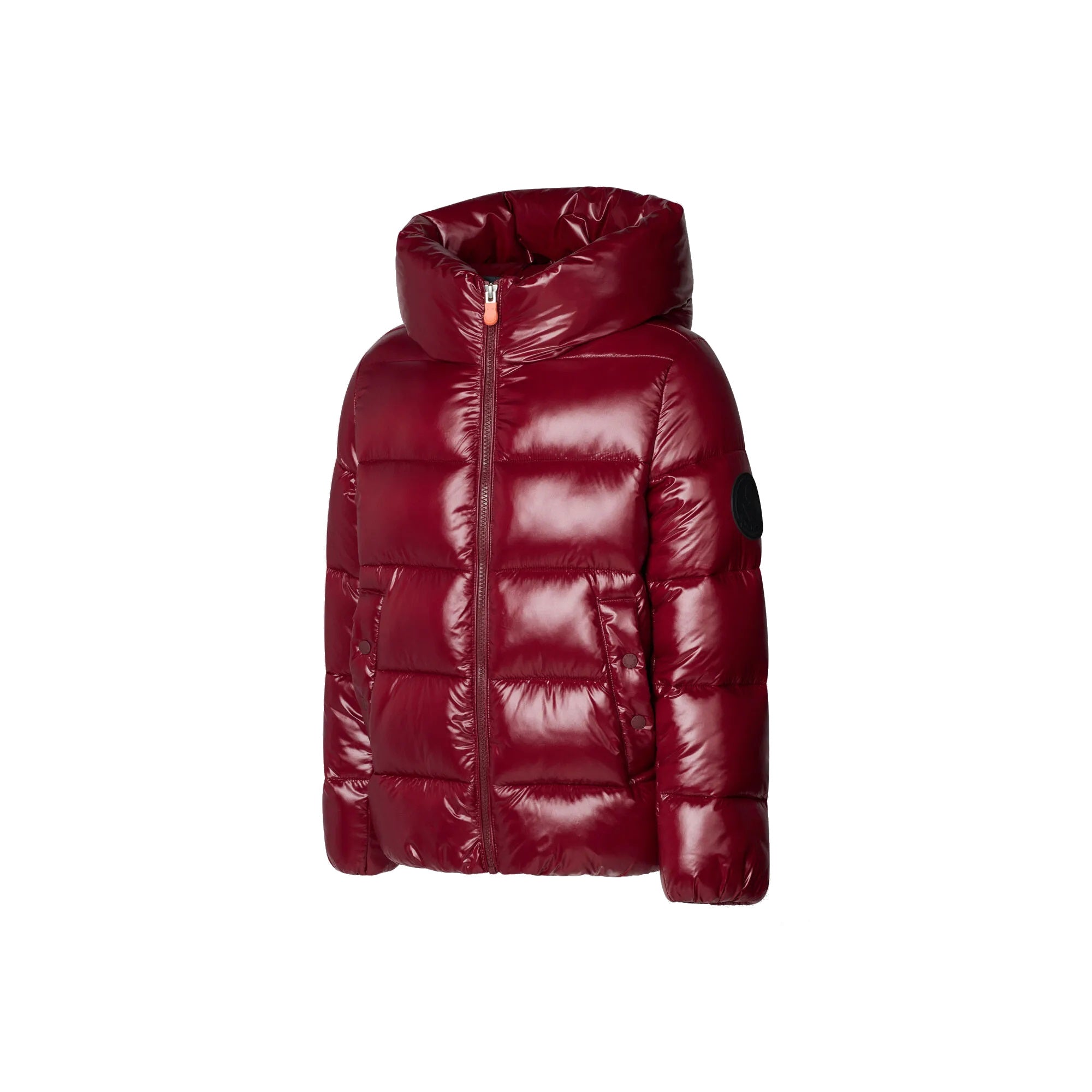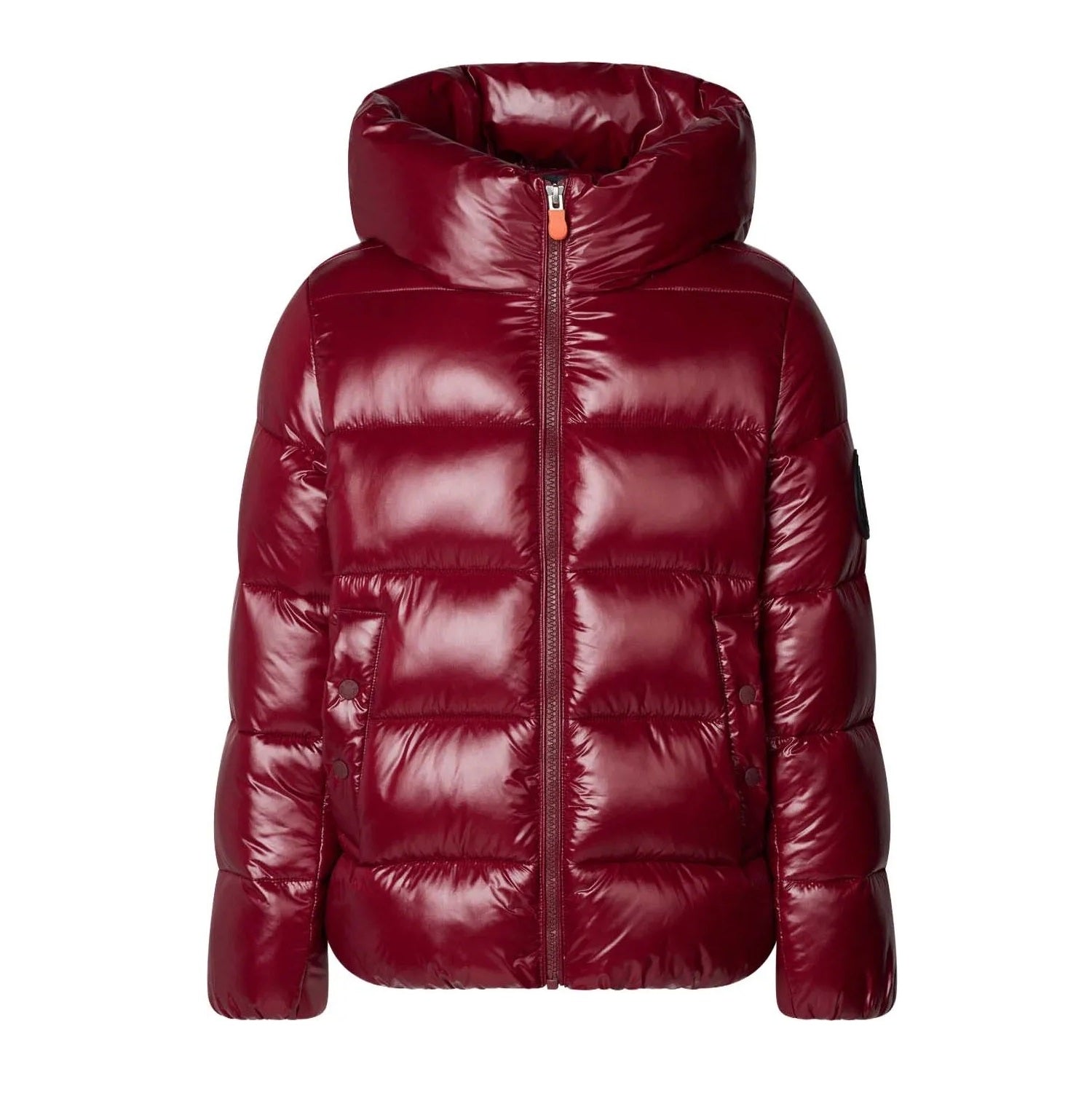 Piumino SAVE THE DUCK rosso con morbida imbottitura animal-free e la finitura laqué del nylon. Dotato di due tasche laterali chiuse da bottoni, si distingue per il tiretto personalizzato color arancione e il maxi logo rotondo sulla manica.