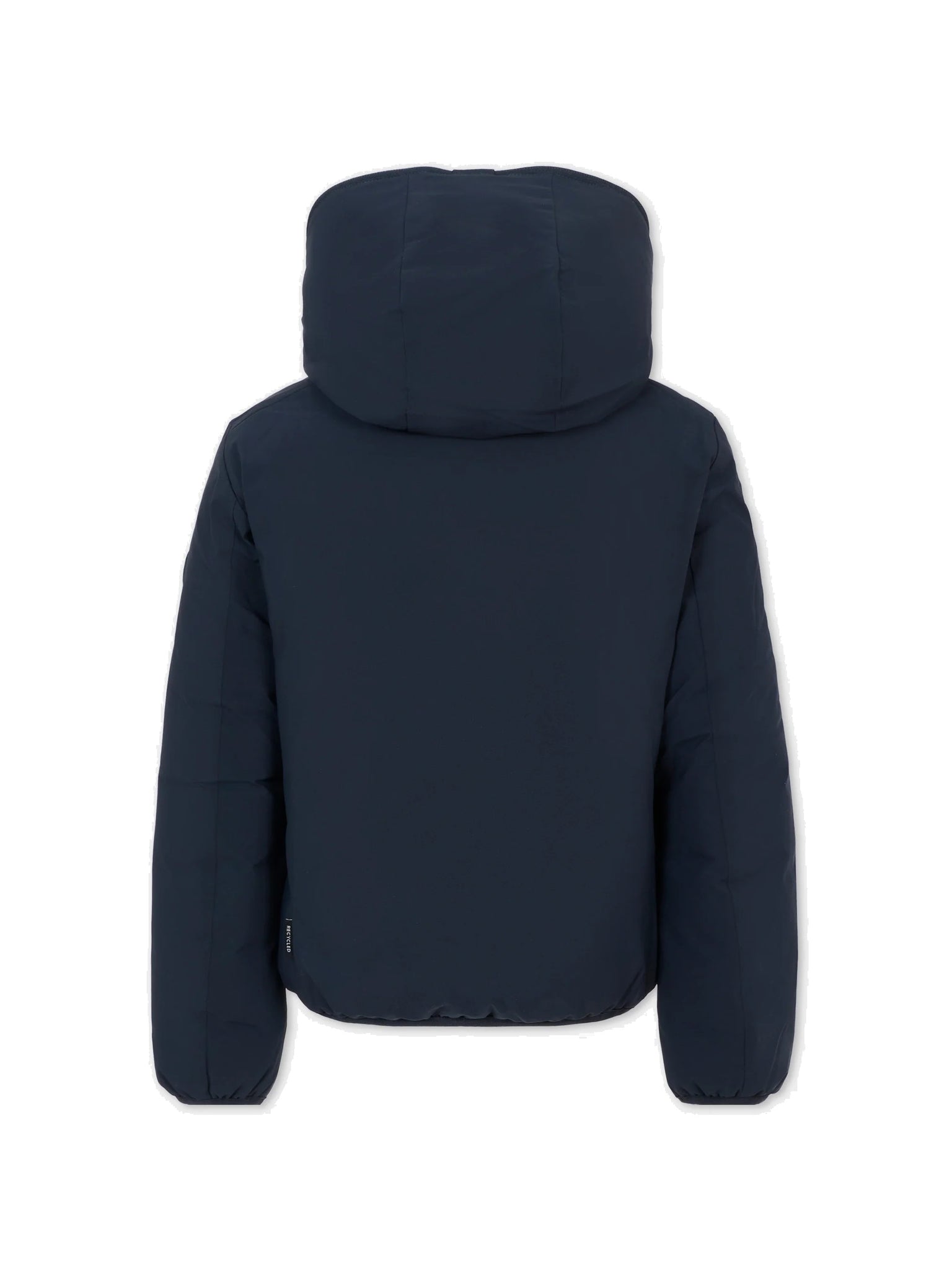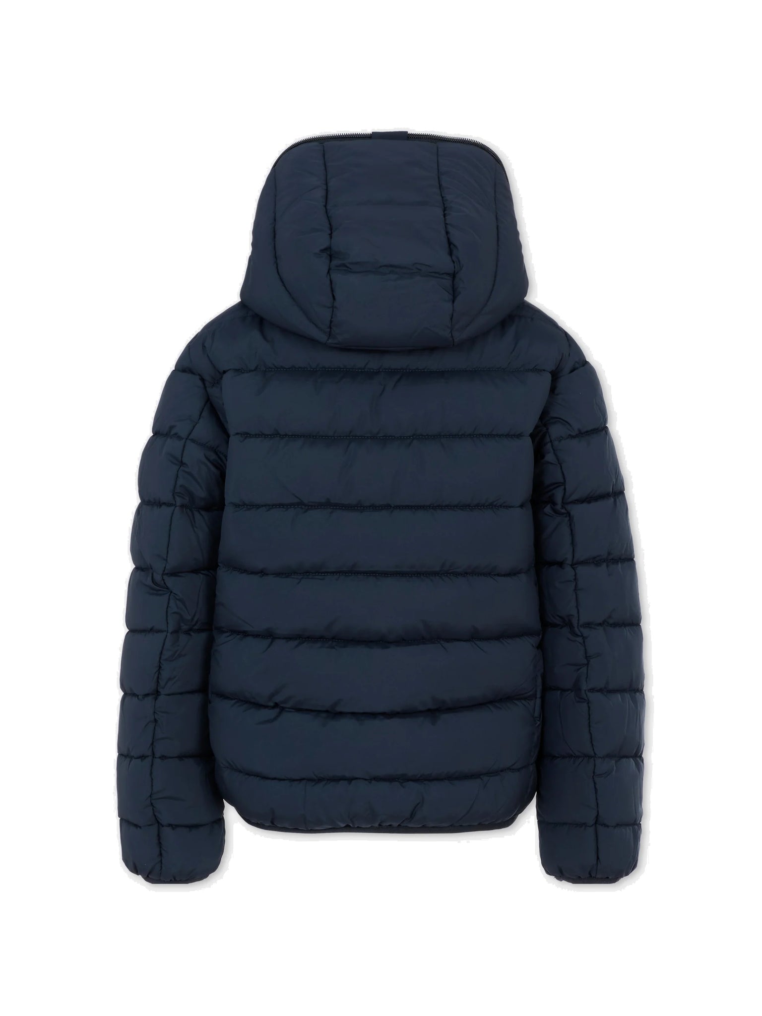 Piumino blu reversibile, con maniche lunghe, cappuccio, chiusura frontale con zip, tasche laterali con zip, polsini e orlo elasticizzati; è imbottito con Plumtech, un'ovatta termica sintetica, realizzata nel rispetto dell'ambiente e degli animali; è traspirante e trattiene il calore. È decorato con logo gommato.
