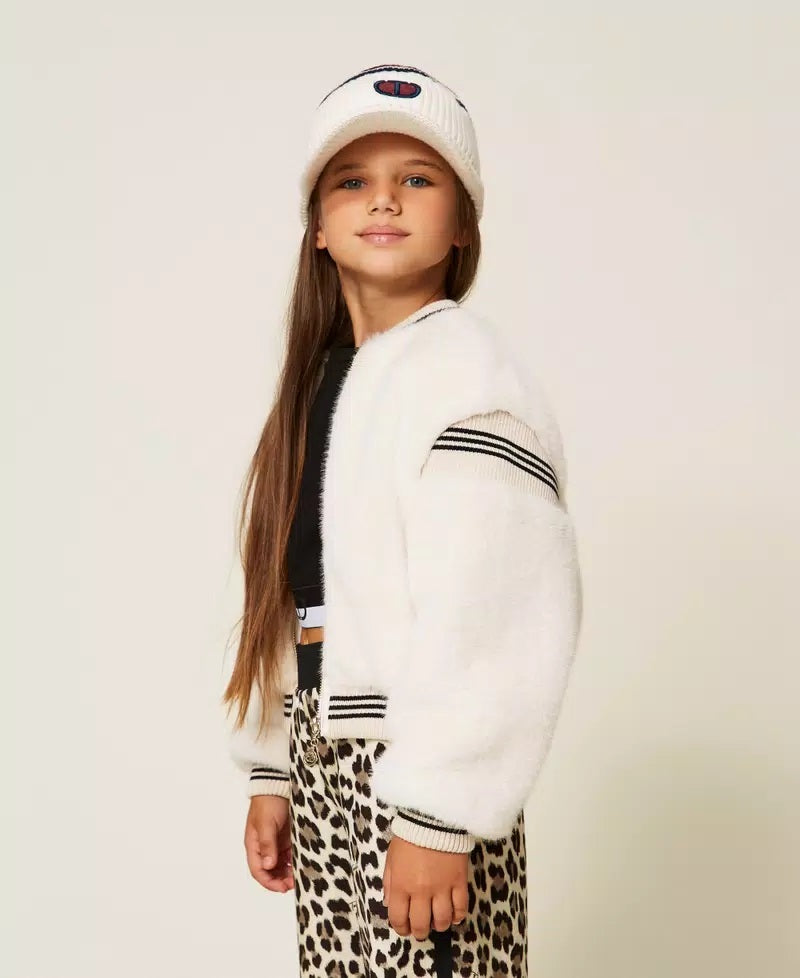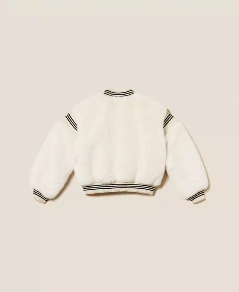 Bomber da bambina in pelliccia sintetica con finiture in costina rigata. Ha chiusura con zip in metallo, maniche lunghe, fodera, linea ampia.