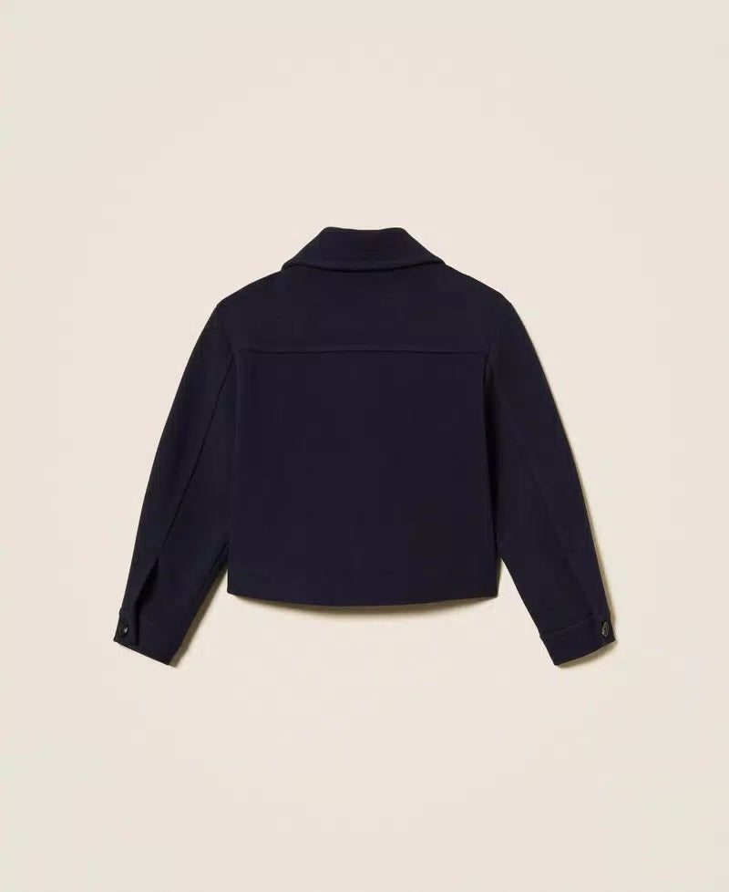 Caban in panno da bambina con tasche applicate davanti con soffietto e bottone logato in metallo. Ha colletto, chiusura con zip in metallo con tirazip logato, maniche lunghe con spalle scese, polsi al fondo con bottoni e asola, fodera, linea dritta.