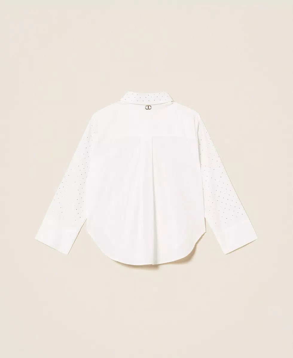 Camicia da bambina in popeline di cotone stretch con full strass. Ha chiusura nascosta con bottoni, maniche lunghe con polsini e bottoni, spalle scese, linea over.
