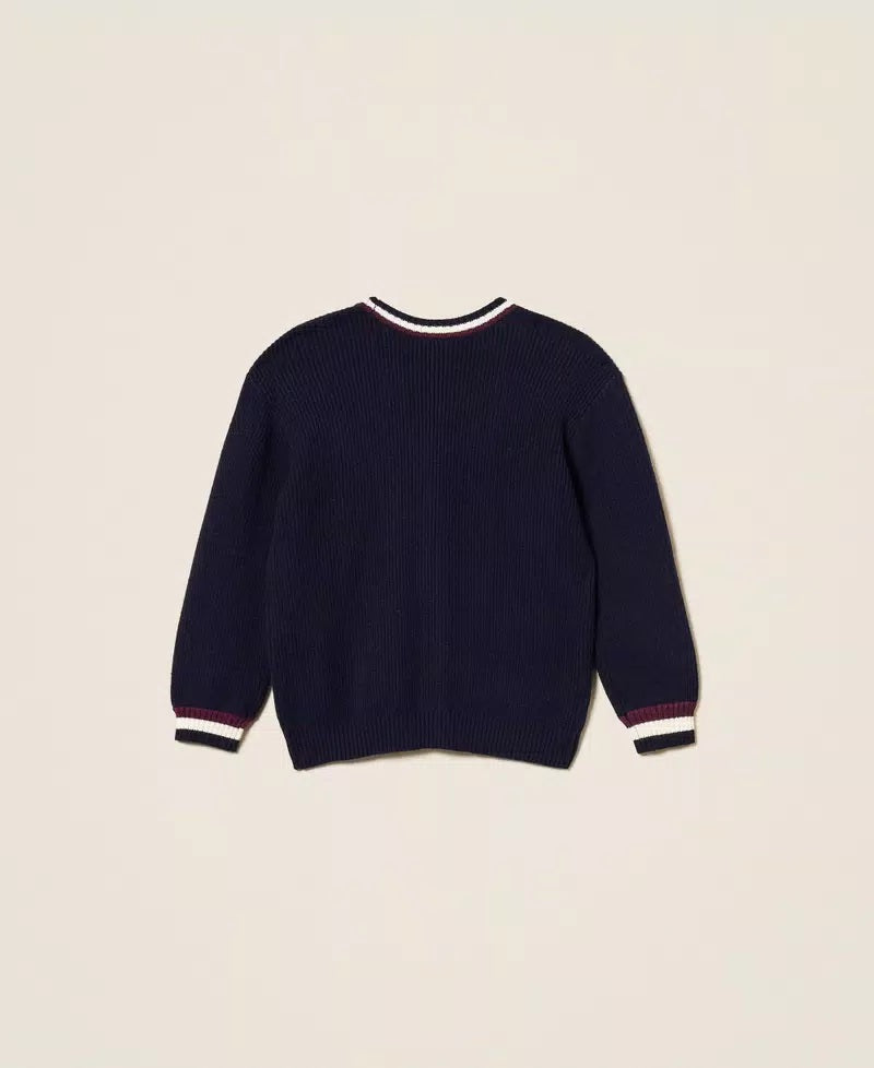 Cardigan da bambina in misto viscosa con lavorazione a costa inglese. Ha profili rifiniti da bande a due colori, scollatura a V, chiusura con bottoni logati Oval T, maniche lunghe, tasche applicate davanti, linea morbida.