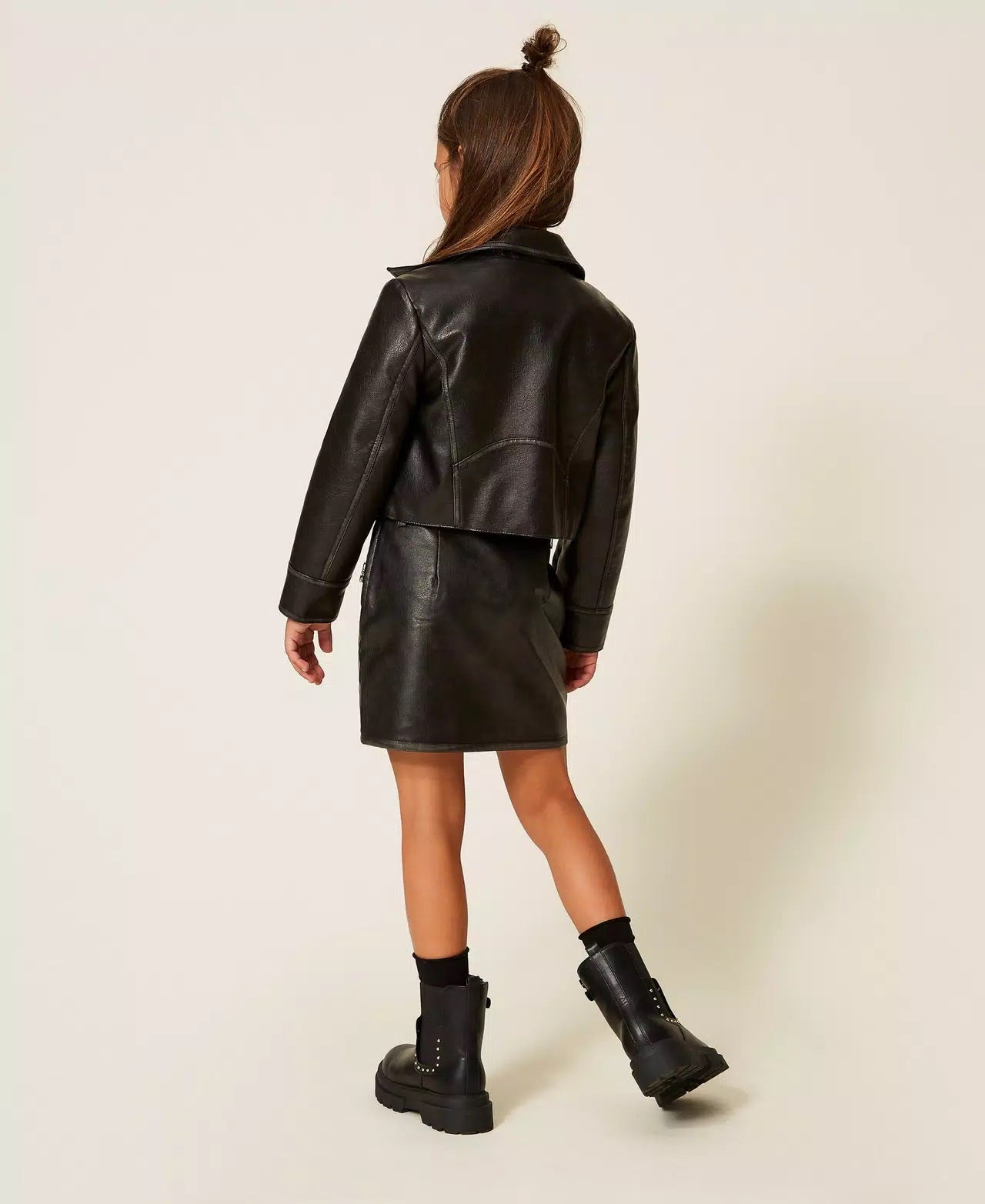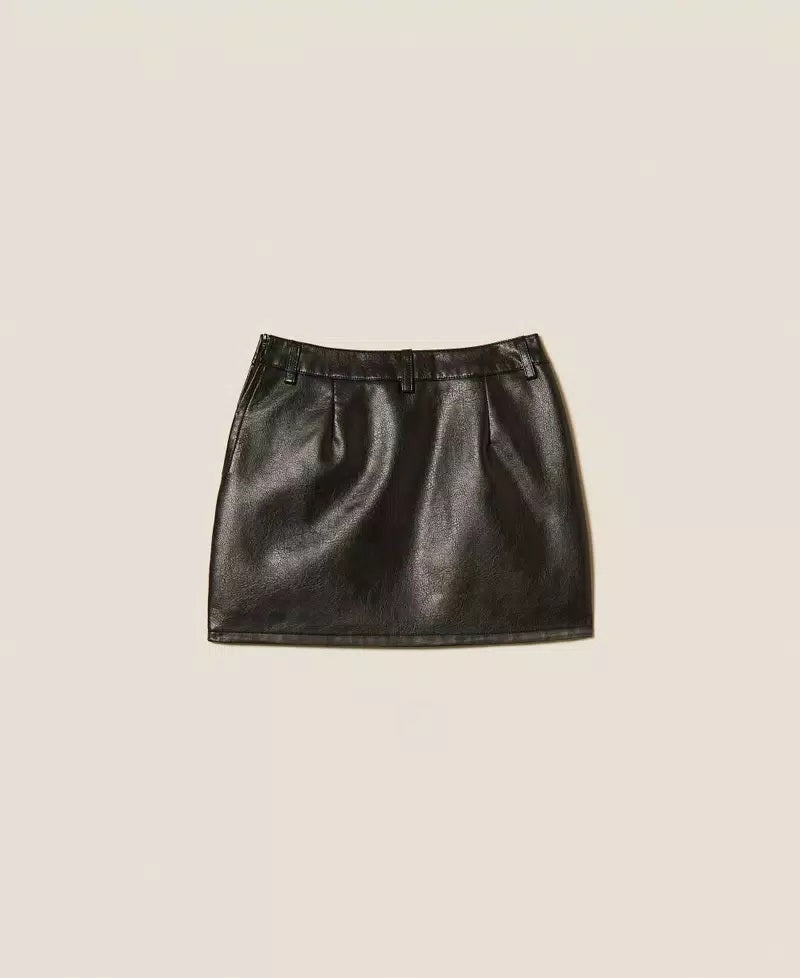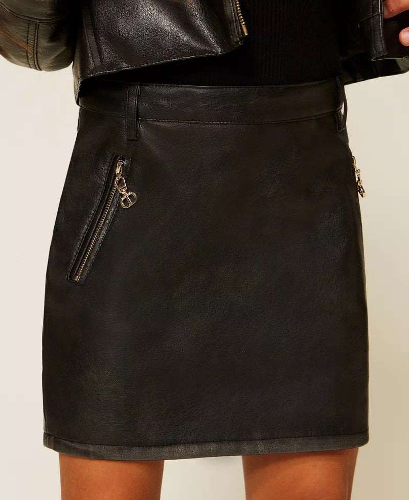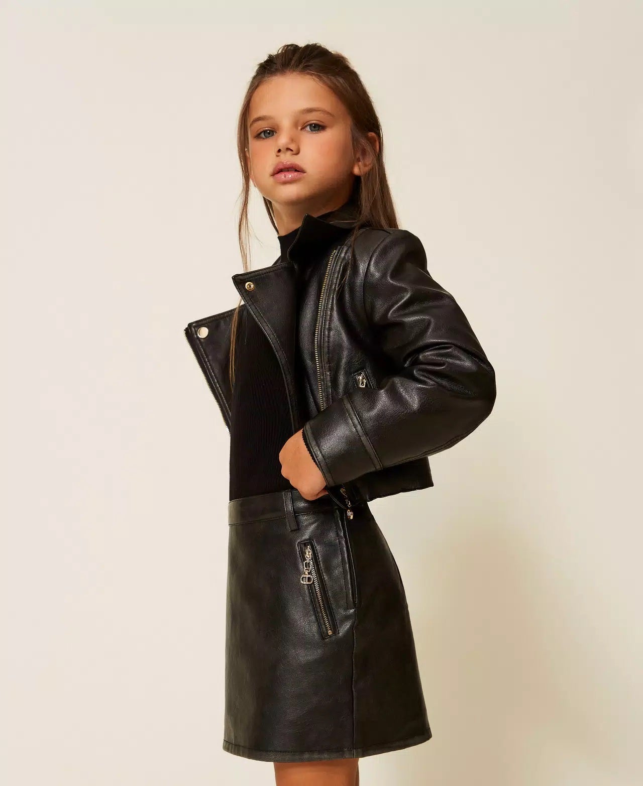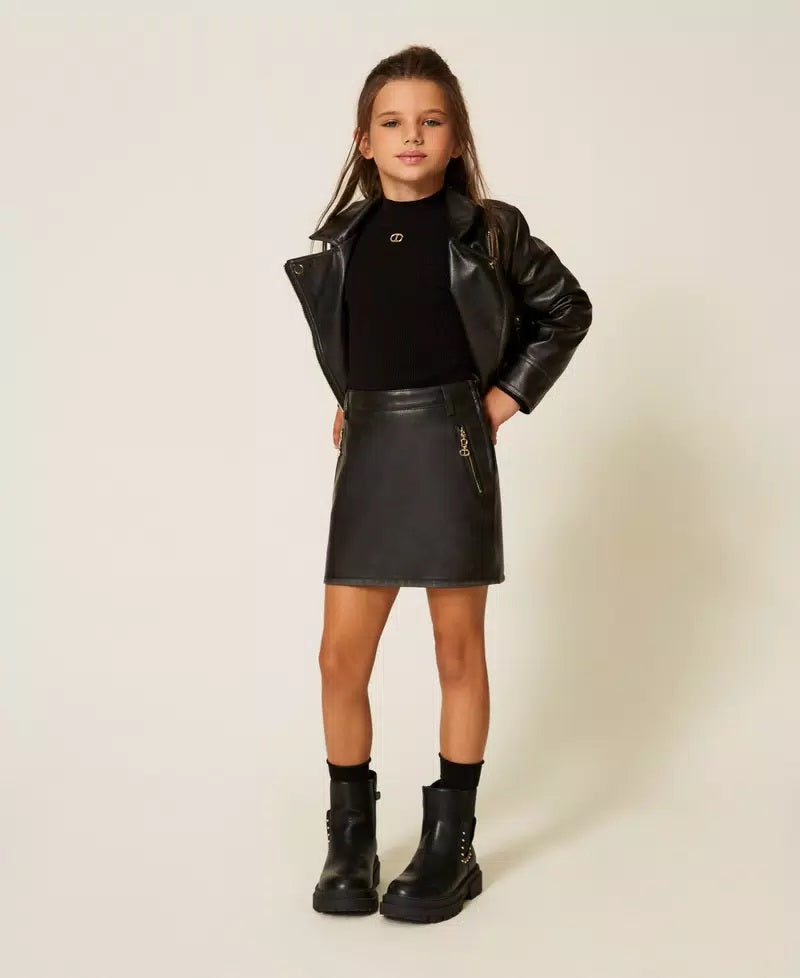 Minigonna da bambina effetto pelle con passanti in vita, chiusura con zip al fianco, tasche inserite con zip in metallo, fodera in cotone, linea dritta.